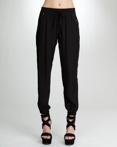 With exposed metal zipper pockets at sides, back slit pockets, and cinched detail at ankle, this bebe pant is the ultimate in off-duty cool. Offers ultra-light wear and drawstring at the waist. Style it with a tank top and strappy sandals to maximize this look. Rise: 11". Inseam: 28". Leg opening: 10".