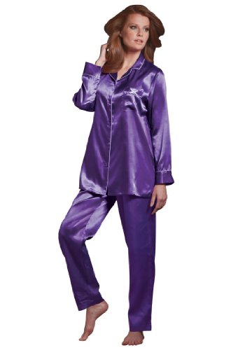 2-piece satin pjs are delightfully smooth and soft in our exclusive feminine prints. We offer the best price and fit in plus size pajamas.Notch collar button-front top has breast pocket with bow, hem slits, contrast piping around collar, placket and sleeve openings; 29" longPull-on elastic-waist satin pants; 28" inseamWashable woven polyester satin USA or imported Women's plus size pajamas and plus size sleepwear in sizes M(14W-16W), L(18W-20W), 1X(22W-24W), 2X(26W-28W), 3X(30W-32W), 4X(34W-36W), 5X(38W-40W)