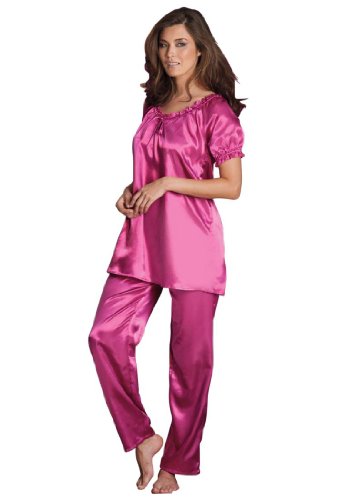 Comfortable and alluring, these pj's make sleep dreamy. Our women's sleepwearhas the best fit and price.ruffle top with keyhole neck and tie, short elasticized sleeves, front and back shirring; 28'pull-on elastic waist pants; 29'washable woven polyester, USA or imported Women's plus size women's sleepwear and plus size pj'sin sizes M(14W-16W), L(18W-20W), 1X(22W-24W), 2X(26W-28W), 3X(30W-32W), 4X(34W-36W), 5X(38W-40W)